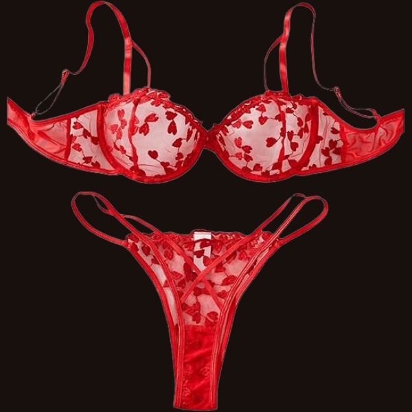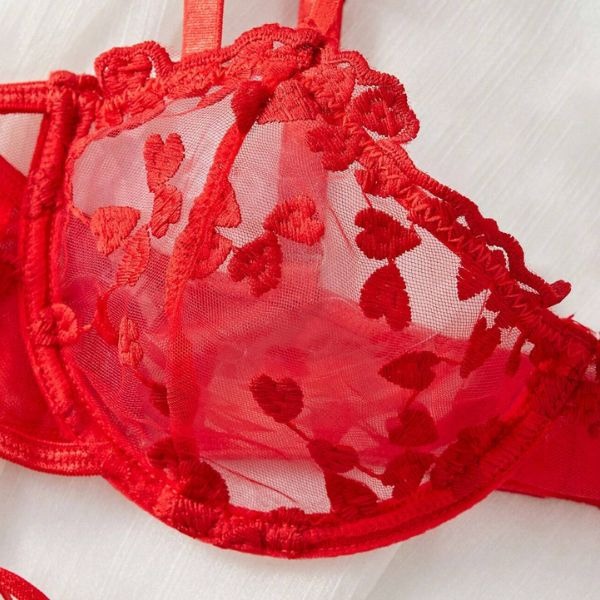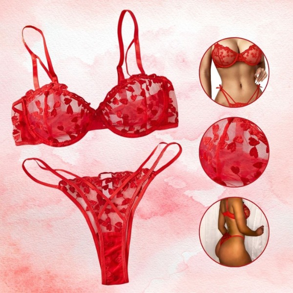 Ovaj crveni komplet donjeg rublja vaš je savršen izbor za Valentinovo! Sa složenim vezom u obliku srca i delikatnim prozirnim mrežastim detaljima, ovaj je set osmišljen kako bi poboljšao vašu romantičnu privlačnost.