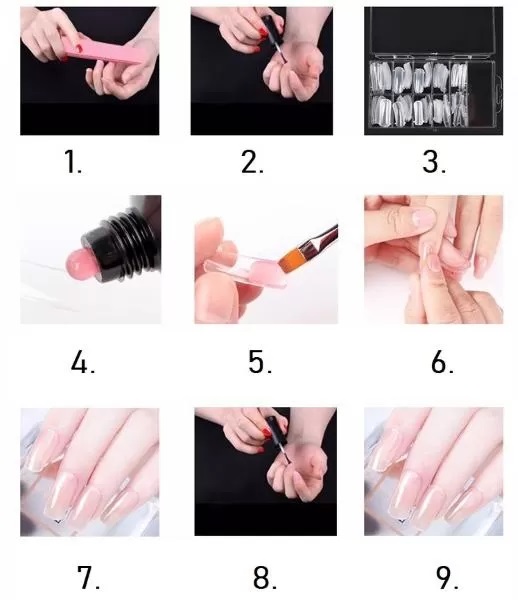 Ispod umjetnog nokta nanesite tanak sloj poly gela, koji ćete zatim prilijepiti na svoj nokat. Nakon sušenja ispod LED svjetiljke, umjetni nokat jednostavno odlijepite.